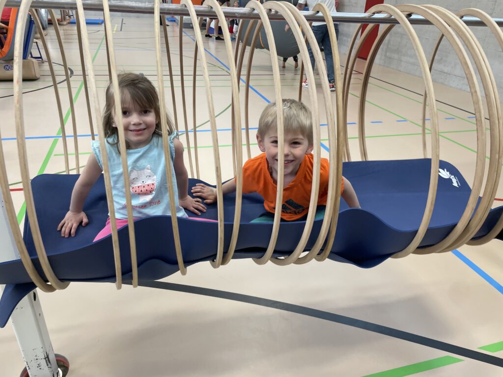Eine abwechslungsreiche und tolle Bewegungslandschaft, vergleichbar mit einem Indoor-Spielplatz, konnte auf verschiedene Art und Weise erkundet werden. Klettern, hangeln, schaukeln, schwingen, balancieren, kriechen, springen, rollen und drehen, für alle war etwas dabei.
